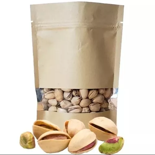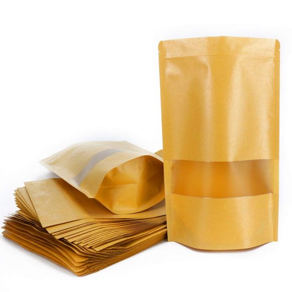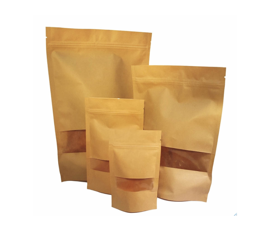 Color kraft o beige con ventana transparente y cierre zip.