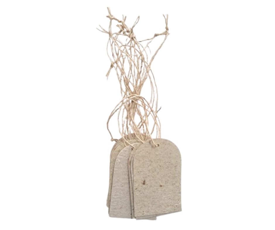 Empaque x 12 unidades. Medidas Etiqueta: 8 x 5 cm. Incluye cordón de fique.