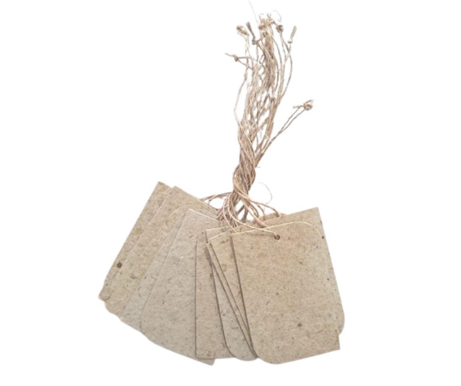 Empaque x 12 unidades. Medidas Etiqueta: 8 x 5 cm. Incluye cordón de fique.